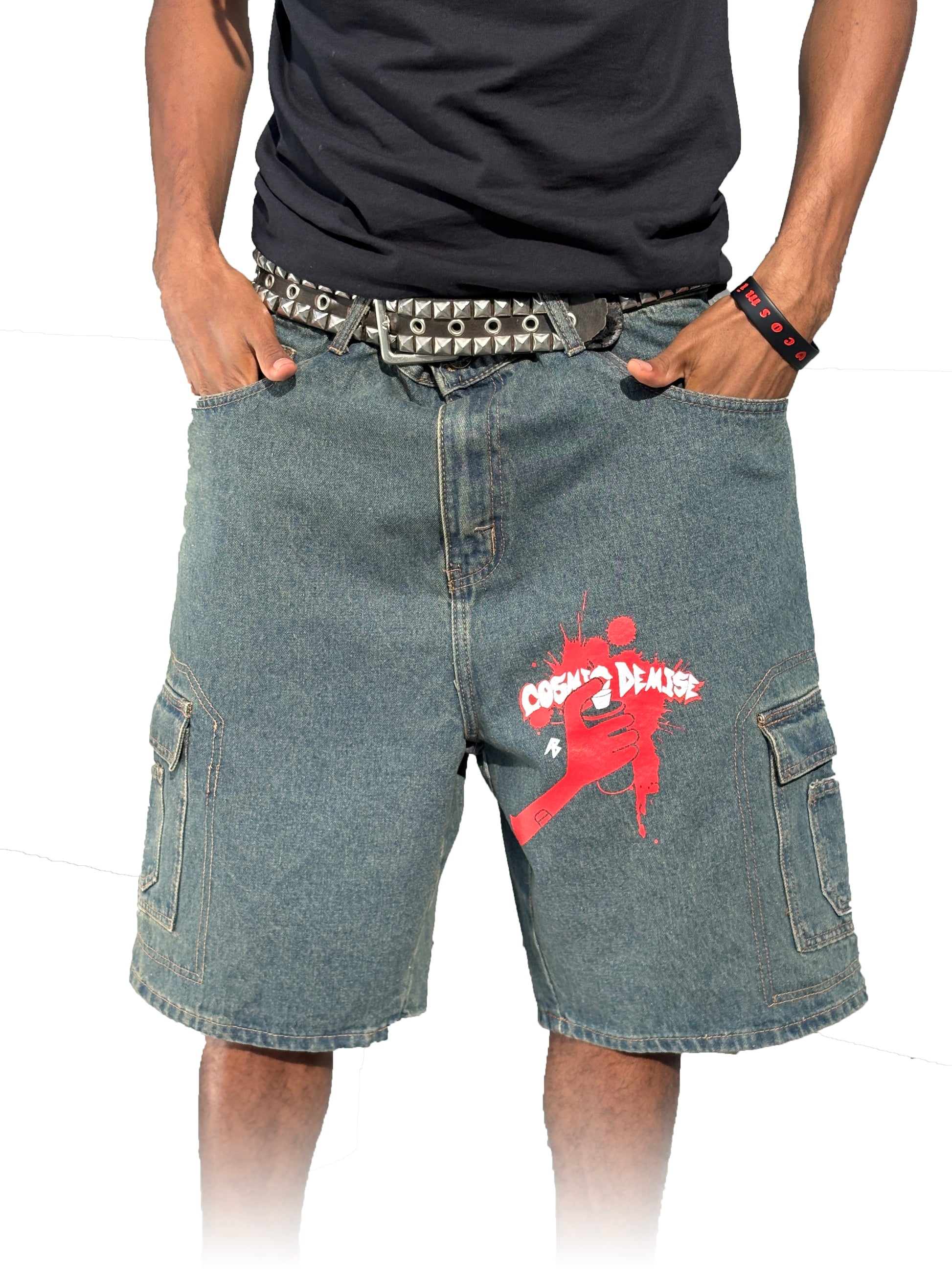 Cosmic Demise shorts, Y2K jorts, baggy skater shorts, 90s cargo denim shorts, men’s grunge fashion, graffiti streetwear, oversized jorts, hip-hop skate style, alt fashion shorts, red graphic denim